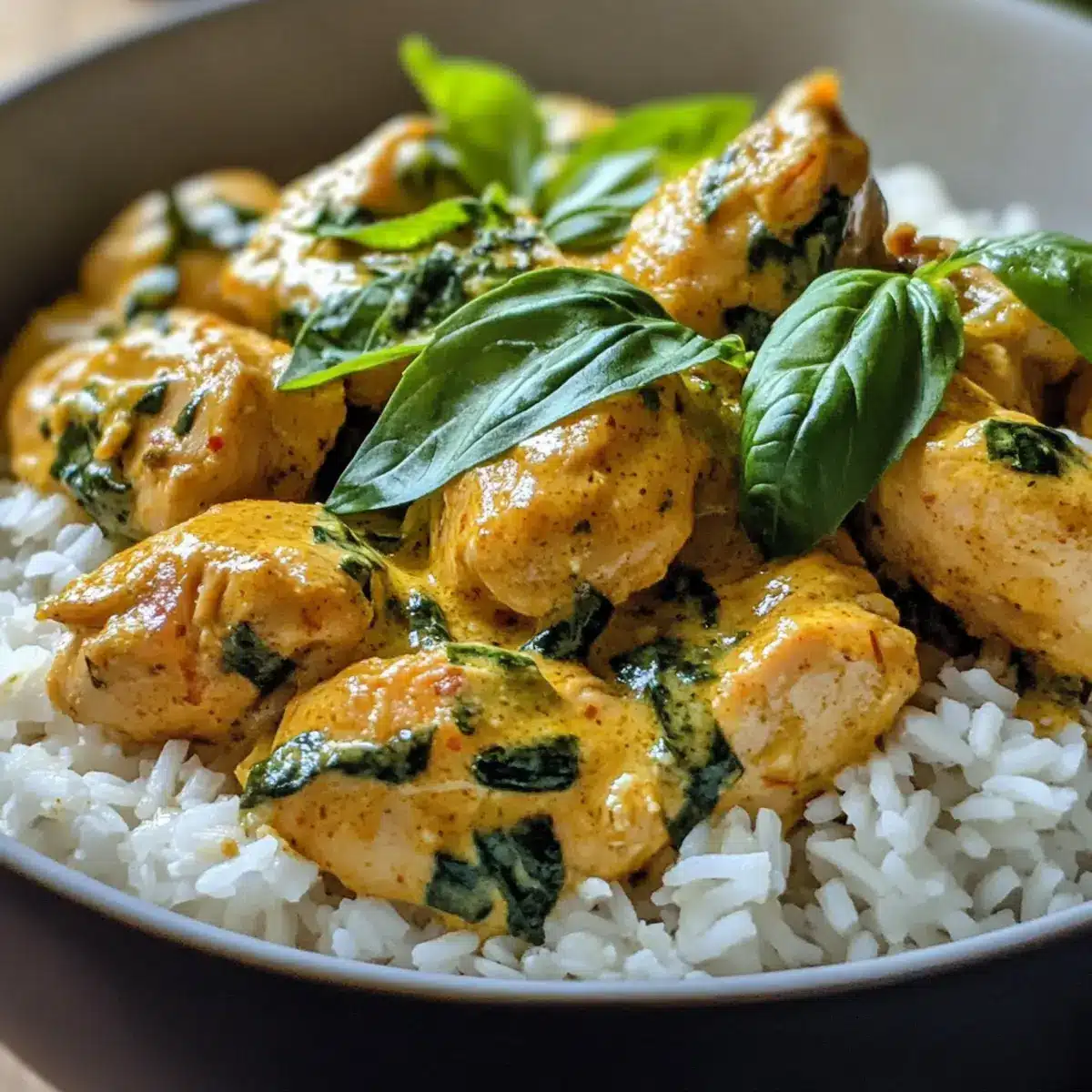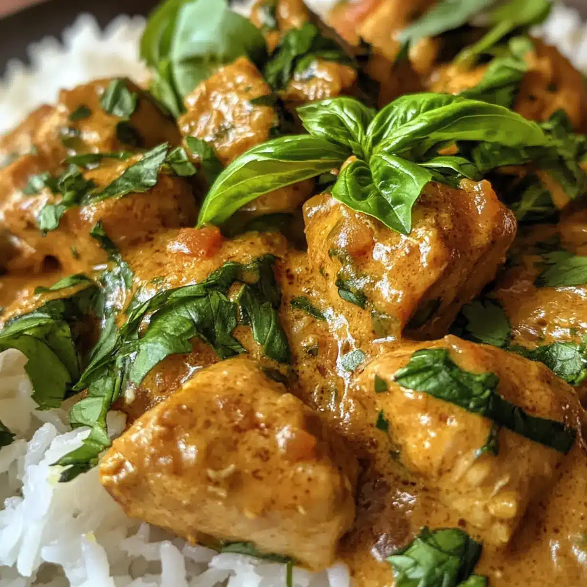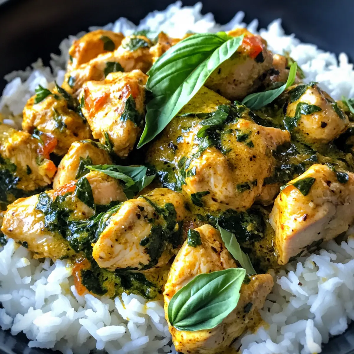 Vibrant Flavors: Each bite of this Basil Chicken with Coconut Curry Sauce bursts with a delicious medley of spices and creamy coconut, creating an unforgettable taste experience.