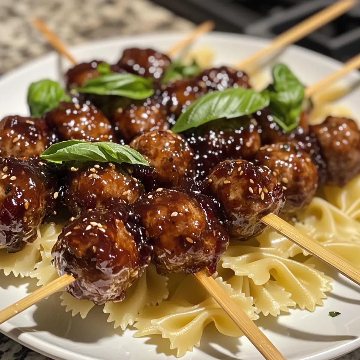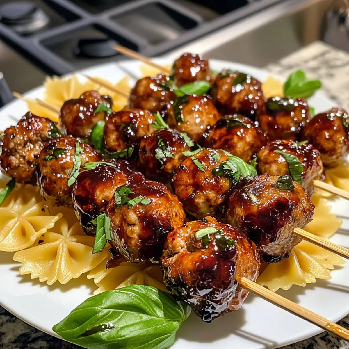 Once all the skewers are assembled, arrange them neatly on a serving platter. For an extra touch of flavor, drizzle any remaining glaze over the skewers. This little addition adds visual appeal and ensures every bite is packed with the delightful sweet-tangy goodness of the Bowtie Pasta and Cocktail Meatball Skewers.