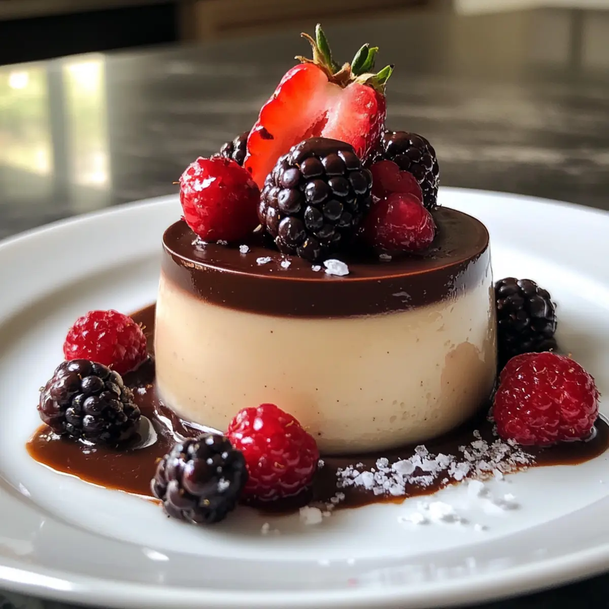 - Once the panna cotta has set, pour the chocolate ganache over each chilled glass and serve, optionally garnished with fresh berries or sea salt.