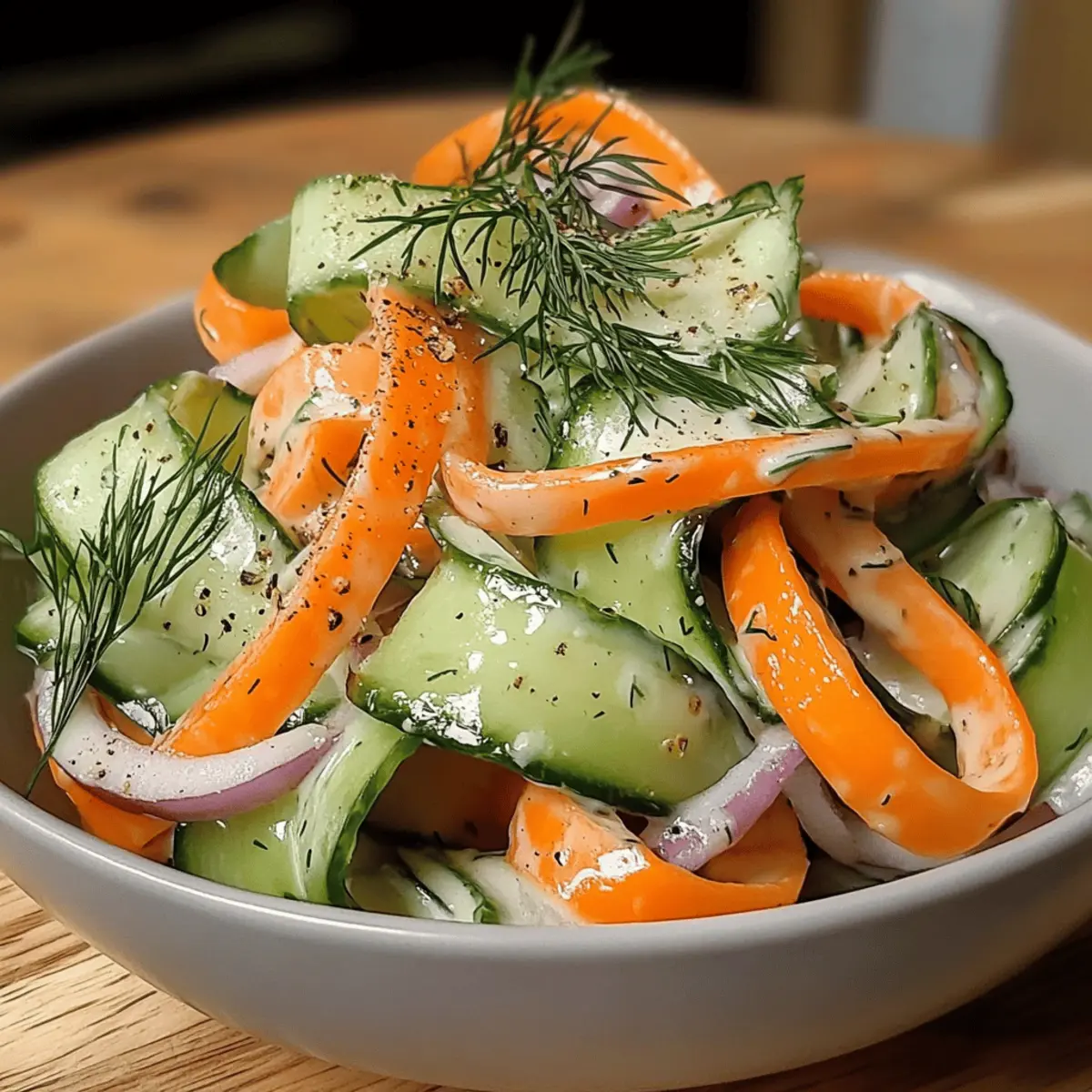 - Gently combine the carrot ribbons, cucumber ribbons, red onion, and dill in a large bowl.