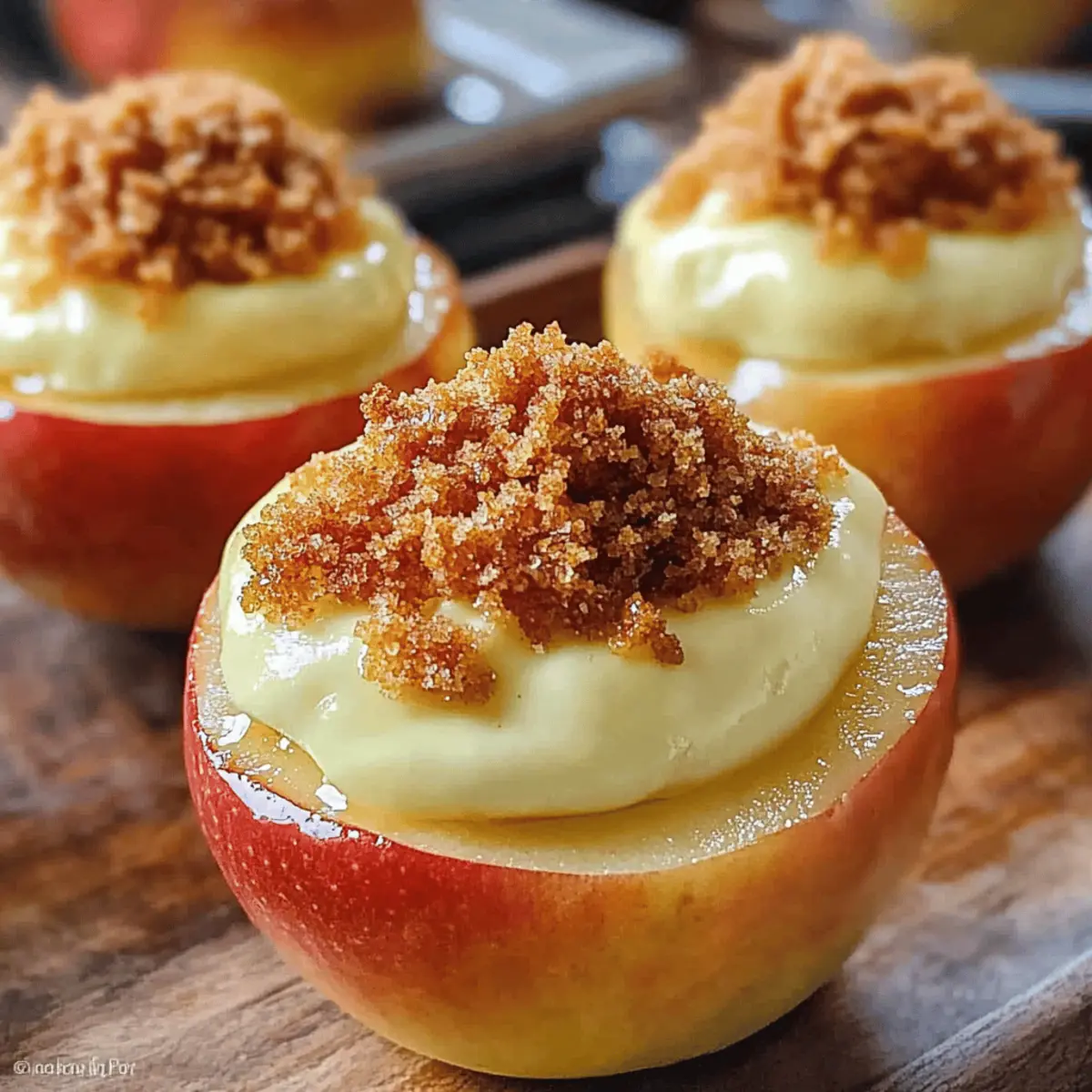 - Carefully fill each apple with the creamy cheesecake mixture, leaving space for puffing.