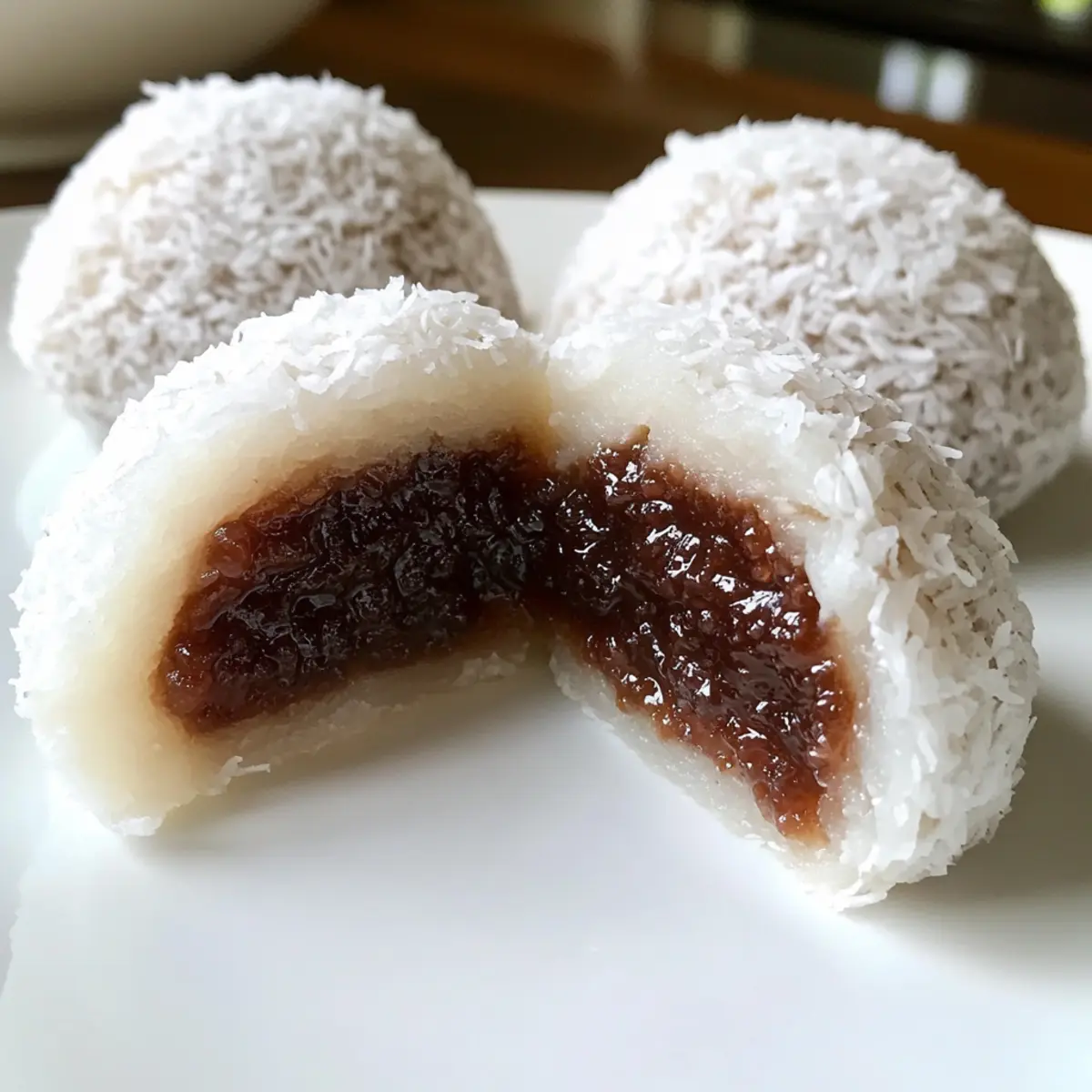 - Divide the dough into 10 equal pieces. Roll each piece into a ball, flatten it, and place a small ball of red bean paste in the center. Fold edges to seal and roll in shredded coconut.