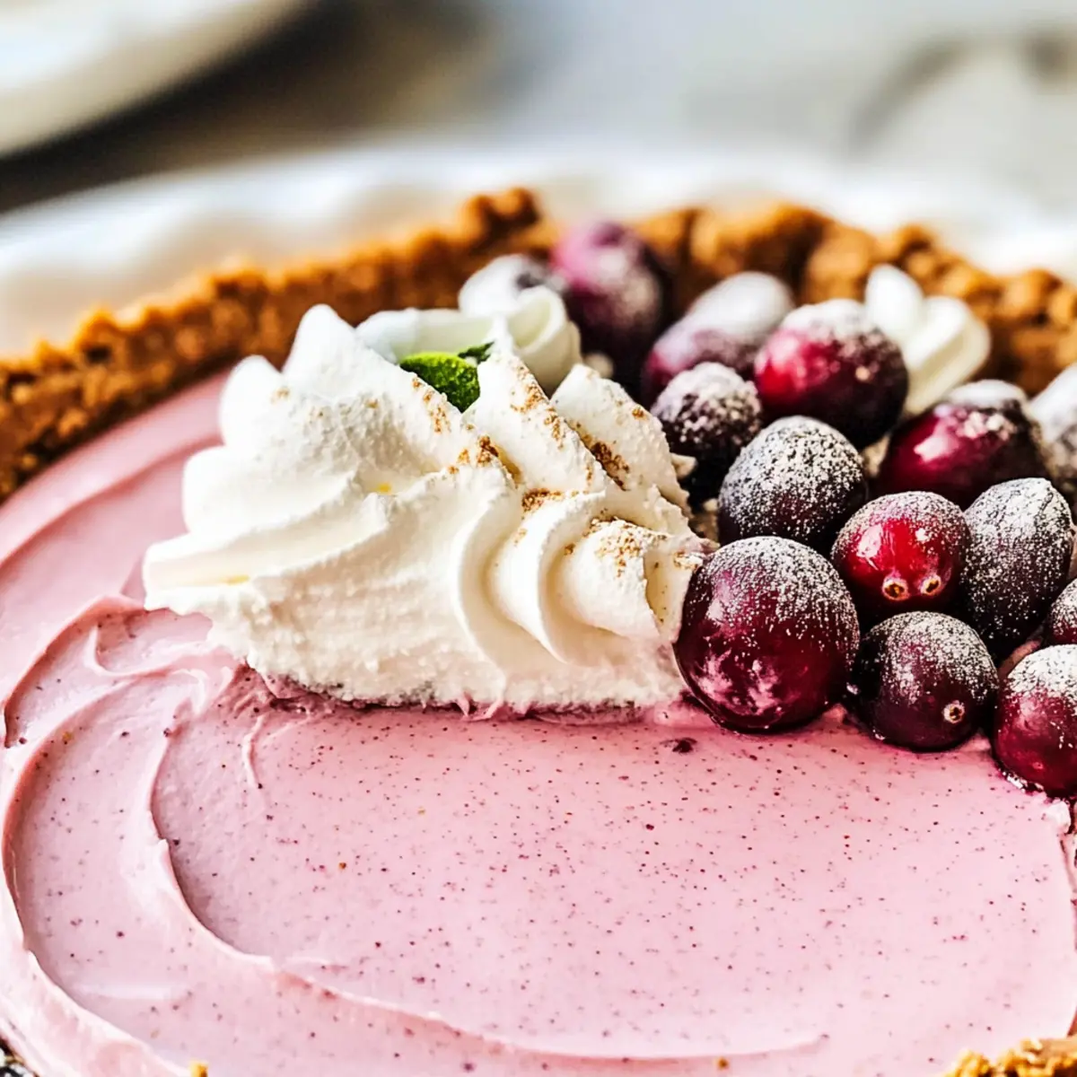 Once the pie is fully set, remove it from the refrigerator. Garnish with whipped topping, sugared cranberries, and fresh mint leaves on top for a festive touch. This final step adds not only beauty but also an additional layer of flavor to your stunning Cranberry Mousse Pie, elevating the presentation and making it irresistible!