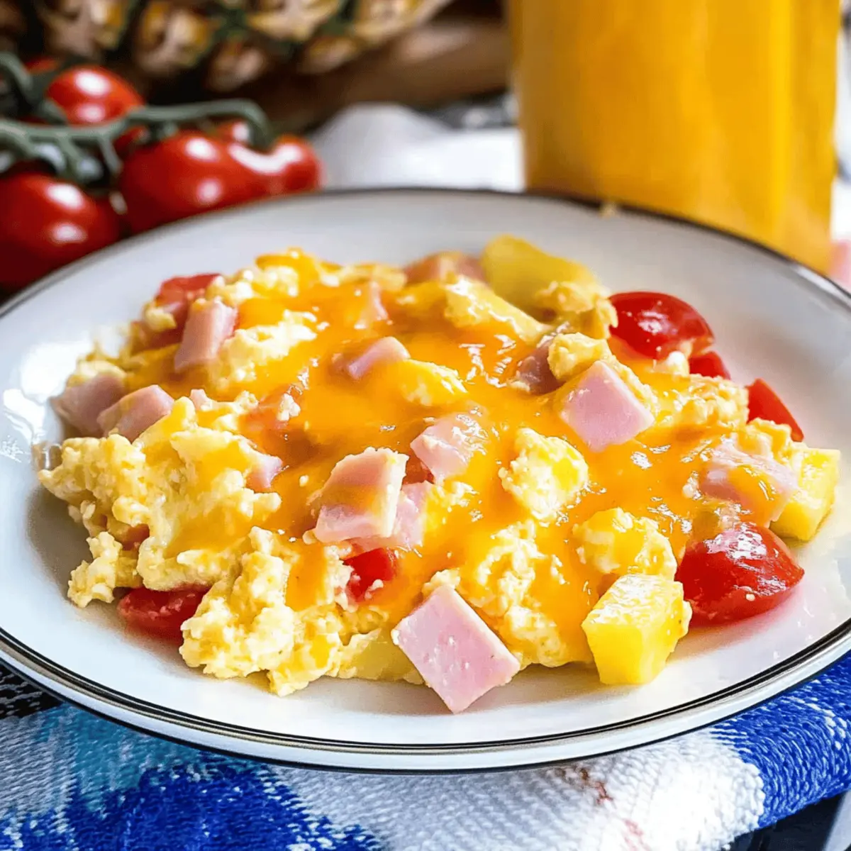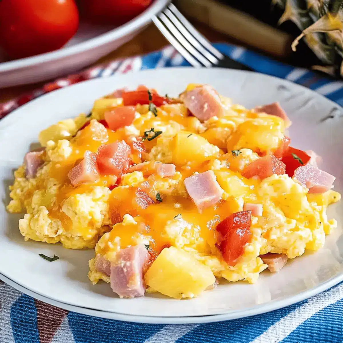 Hawaiian Scrambled Eggs with Cheese is a delightful breakfast dish featuring fluffy eggs, savory ham, juicy tomatoes, and sweet pineapple.