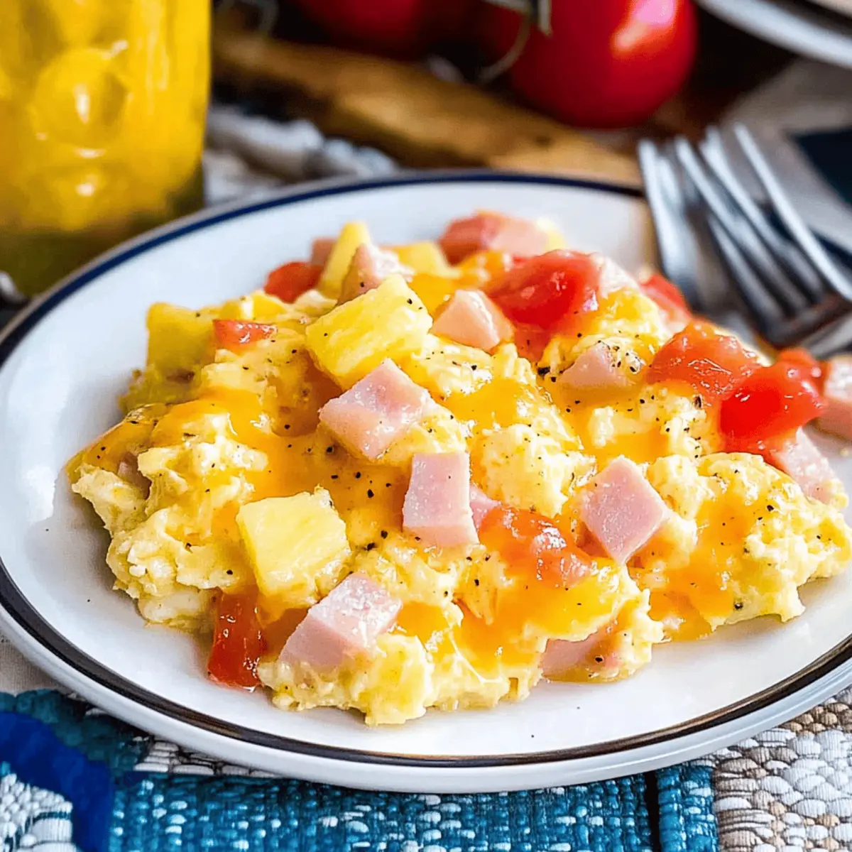 The aroma of sizzling eggs filled the kitchen as I whisked together a medley of flavors that would transport my taste buds straight to a tropical paradise. That’s when I decided to whip up Hawaiian Scrambled Eggs with Cheese—an irresistible blend of fluffy eggs, savory ham, juicy tomatoes, and the sweet punch of pineapple. This dish is not only a delightful way to break the breakfast routine, but it also comes together in no time, making it perfect for busy mornings or leisurely brunches. Plus, it’s gluten-free, so everyone can enjoy this comforting meal. If you’re ready to elevate your breakfast game and impress your loved ones, let’s take a quick dive into this tropical delight. What fun twists do you think you might add?