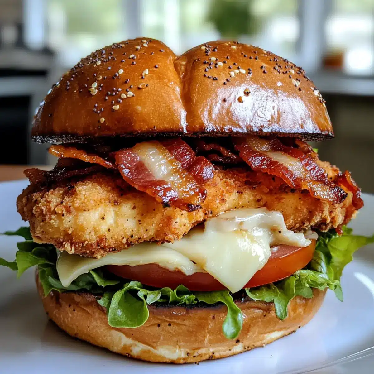Once the chicken cutlets are done, take your soft pretzel buns and place them cut-side up on a clean surface. Layer a chicken cutlet on the bottom half of each bun, followed by a slice of Swiss cheese and three crispy bacon pieces. Drizzle your thickened Honey Dijon sauce generously over the top, then add fresh lettuce and tomato slices if desired.