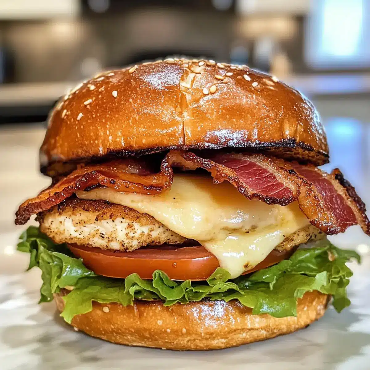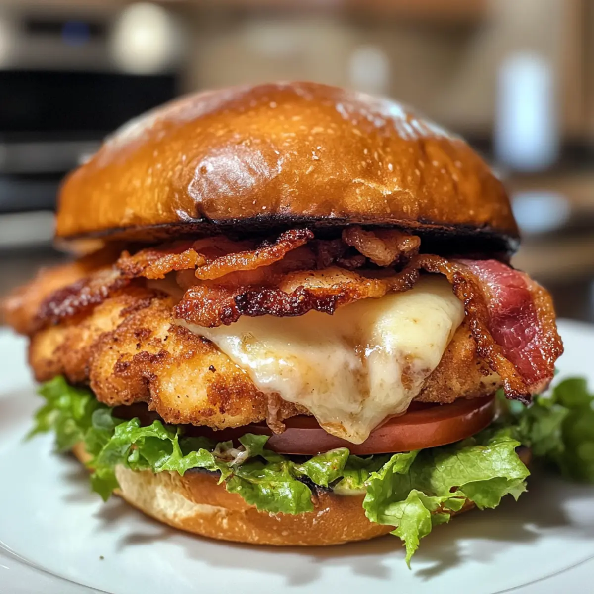 - Once cooked, place the soft pretzel buns cut-side up. Layer a chicken cutlet on the bottom half, followed by a slice of Swiss cheese and three crispy bacon pieces. Drizzle the thickened sauce over the top and add lettuce and tomato slices if desired.