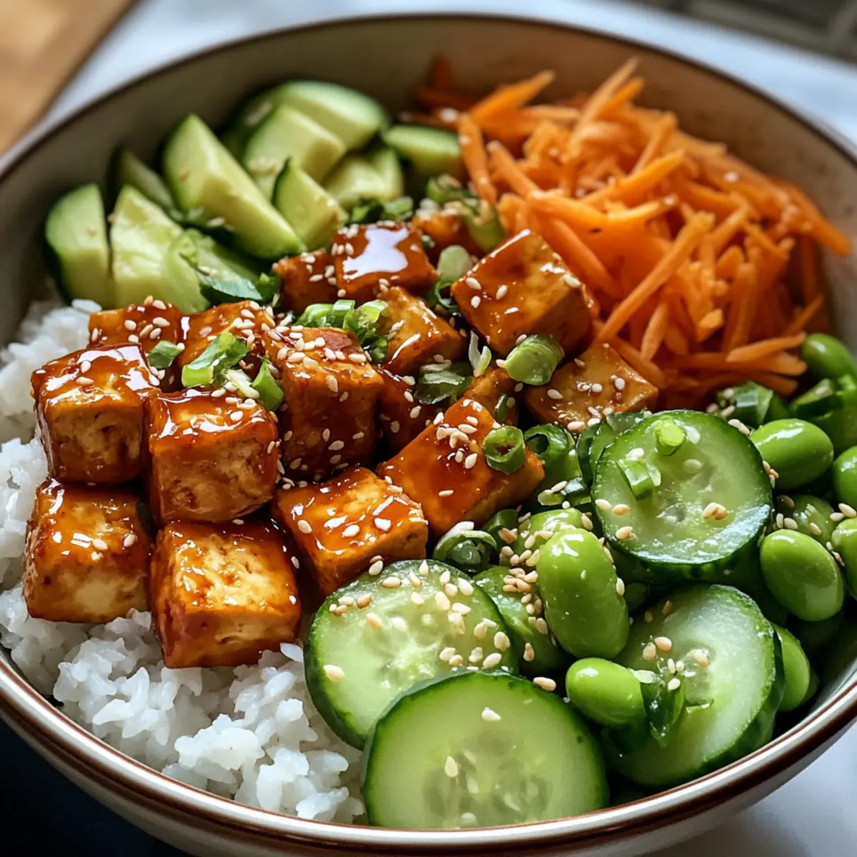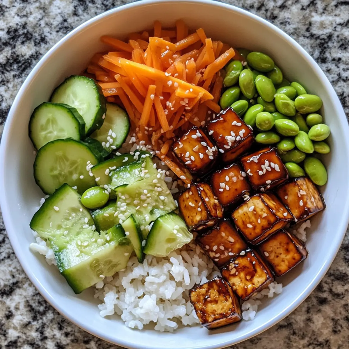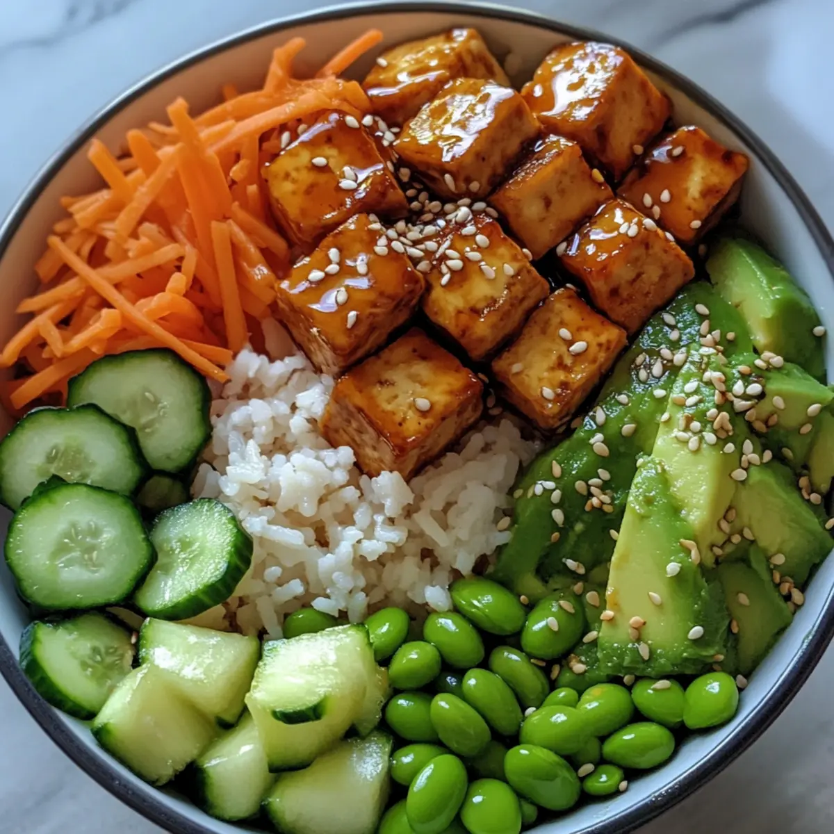 - Assemble the poke bowl by adding rice, topping with glazed tofu, avocado, cucumber, edamame, carrots, and scallions.