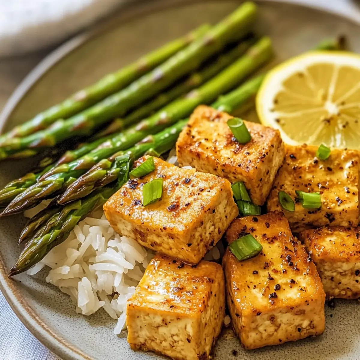 - Return the tofu to the skillet and toss gently in the lemon sauce for 1-2 minutes. Serve alongside roasted asparagus, garnishing with extra lemon zest.