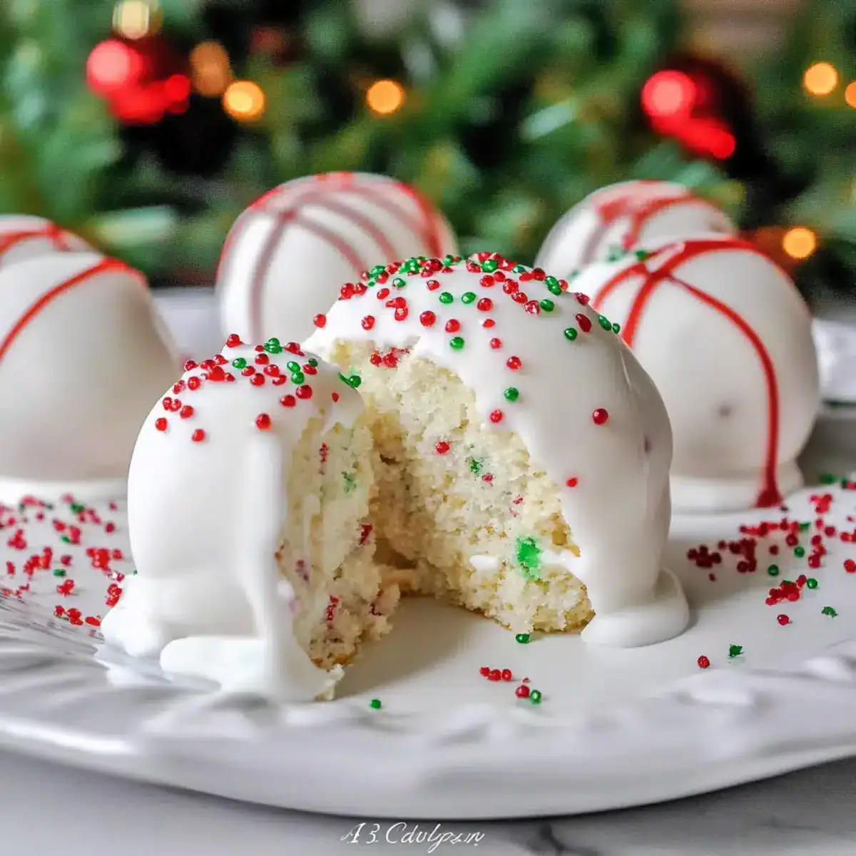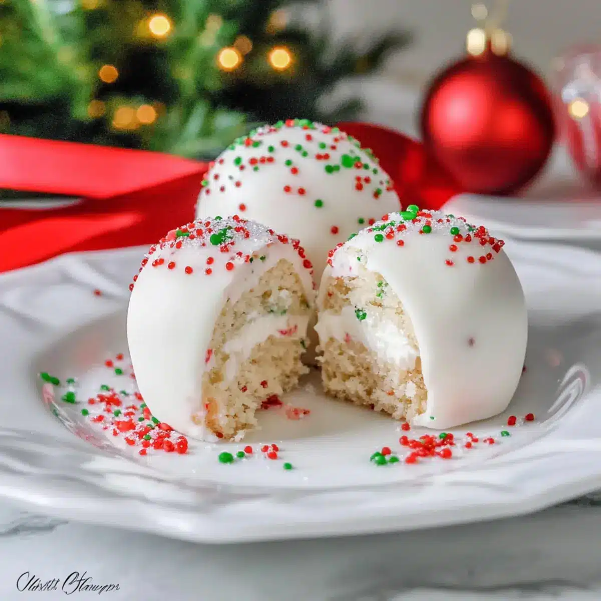 - Sprinkle coated balls with red and green sanding sugar or drizzle with melted red candy.