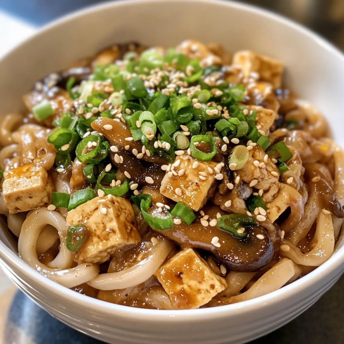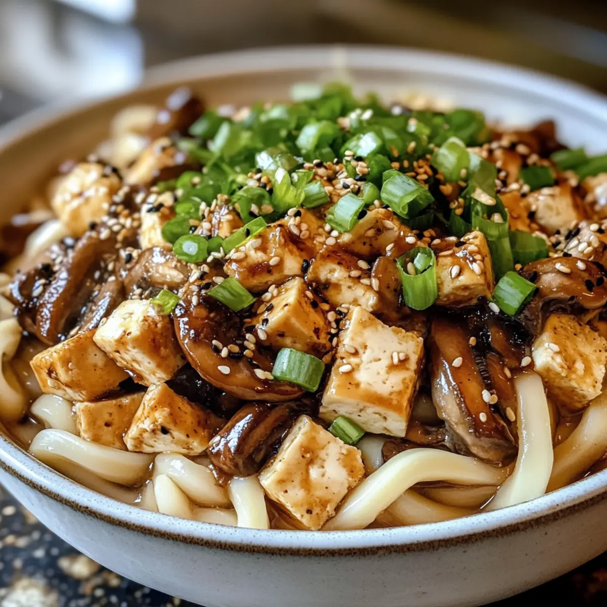 - Divide the cooked udon noodles between serving bowls. Spoon the sautéed mushroom mixture onto one side of the noodles, and generously pour the creamy tofu sauce on the other side. Drizzle with chili oil, sprinkle sesame seeds, and garnish with additional chopped spring onions.