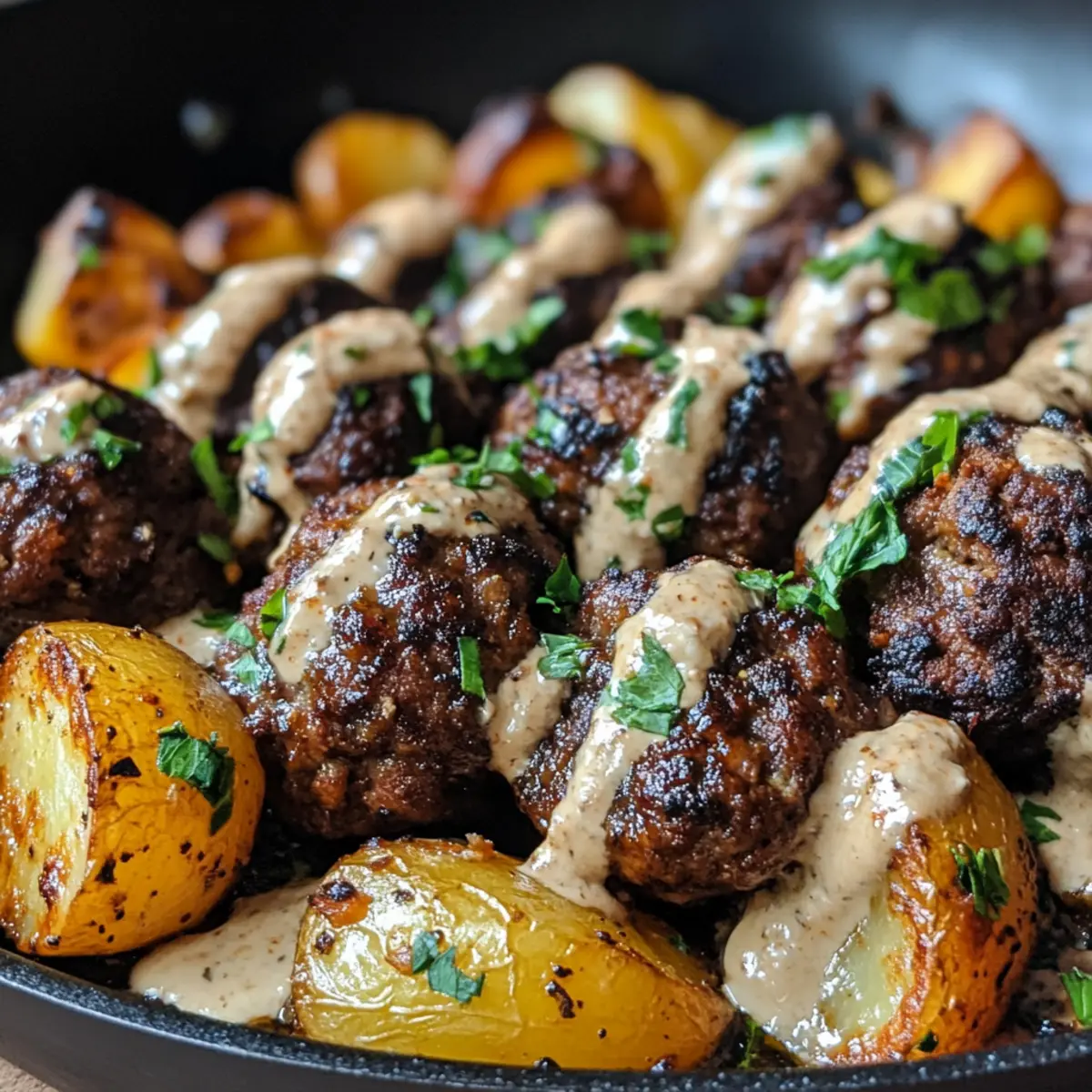 These Mouthwatering Tahini Kofta are a fantastic choice for busy home cooks looking to simplify meal planning! You can prepare the kofta mixture up to 24 hours in advance; simply combine the ground beef, grated onion, garlic, herbs, and breadcrumbs, then refrigerate in an airtight container. The seasoned potatoes can also be prepped ahead by slicing and tossing them with olive oil, salt, and pepper up to 3 days before baking. When you’re ready to enjoy your meal, just bake the koftas and potatoes together as directed. This way, you’ll have a wholesome dinner ready with less hassle, allowing the flavors to shine just as brightly!