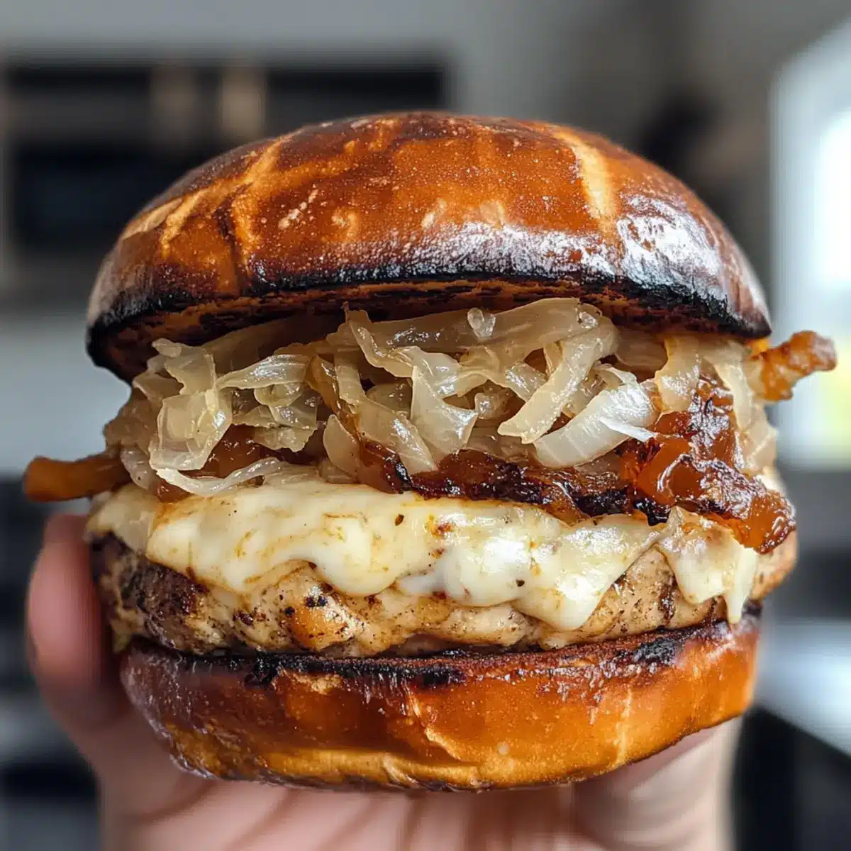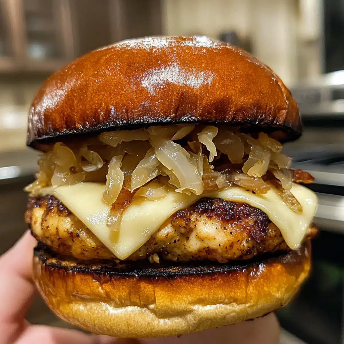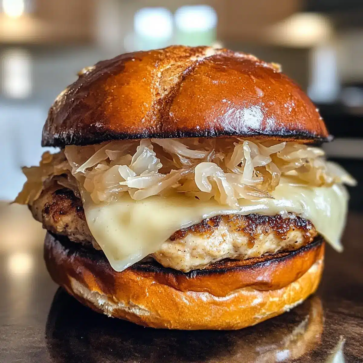 - Assemble the burgers by layering a cheesy patty, sauerkraut, and crispy fried onions on the bottom bun, drizzling with extra maple syrup or Dijon mustard if desired, then topping with the other half of the bun.