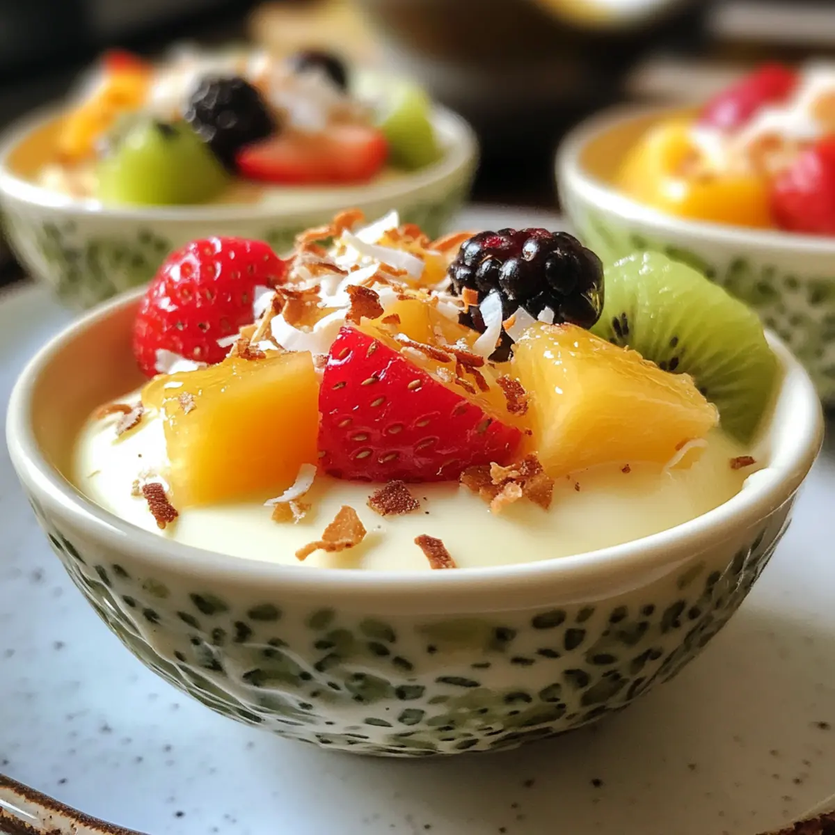 Tropical Fruit Salad: A mix of ripe mango, pineapple, and kiwi complements the creamy panna cotta while adding freshness and color. The juicy sweetness pairs beautifully with the subtle coconut flavor.