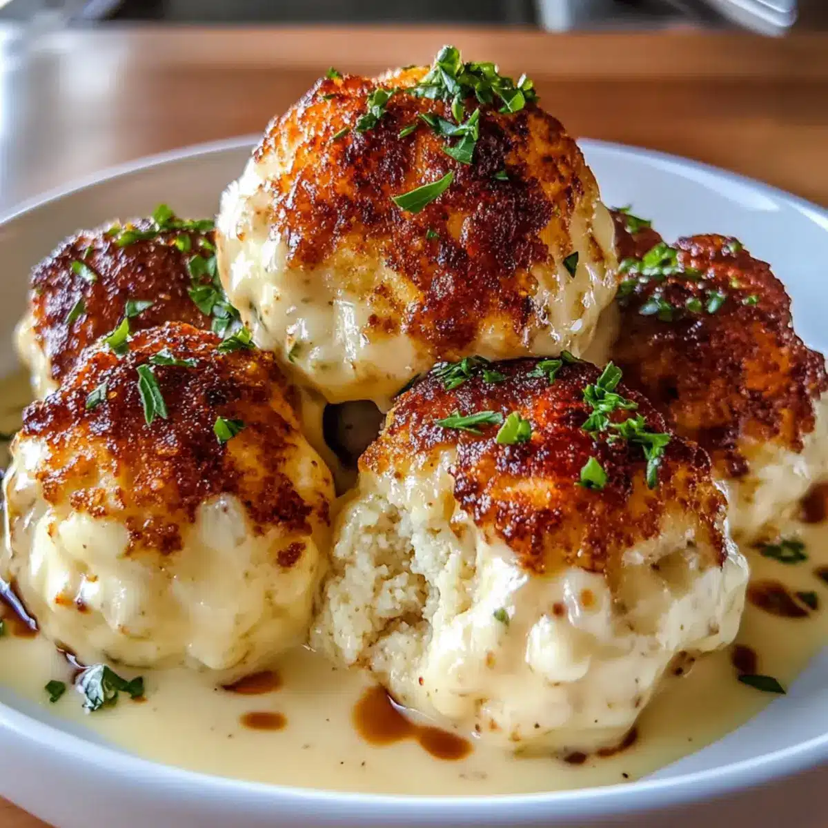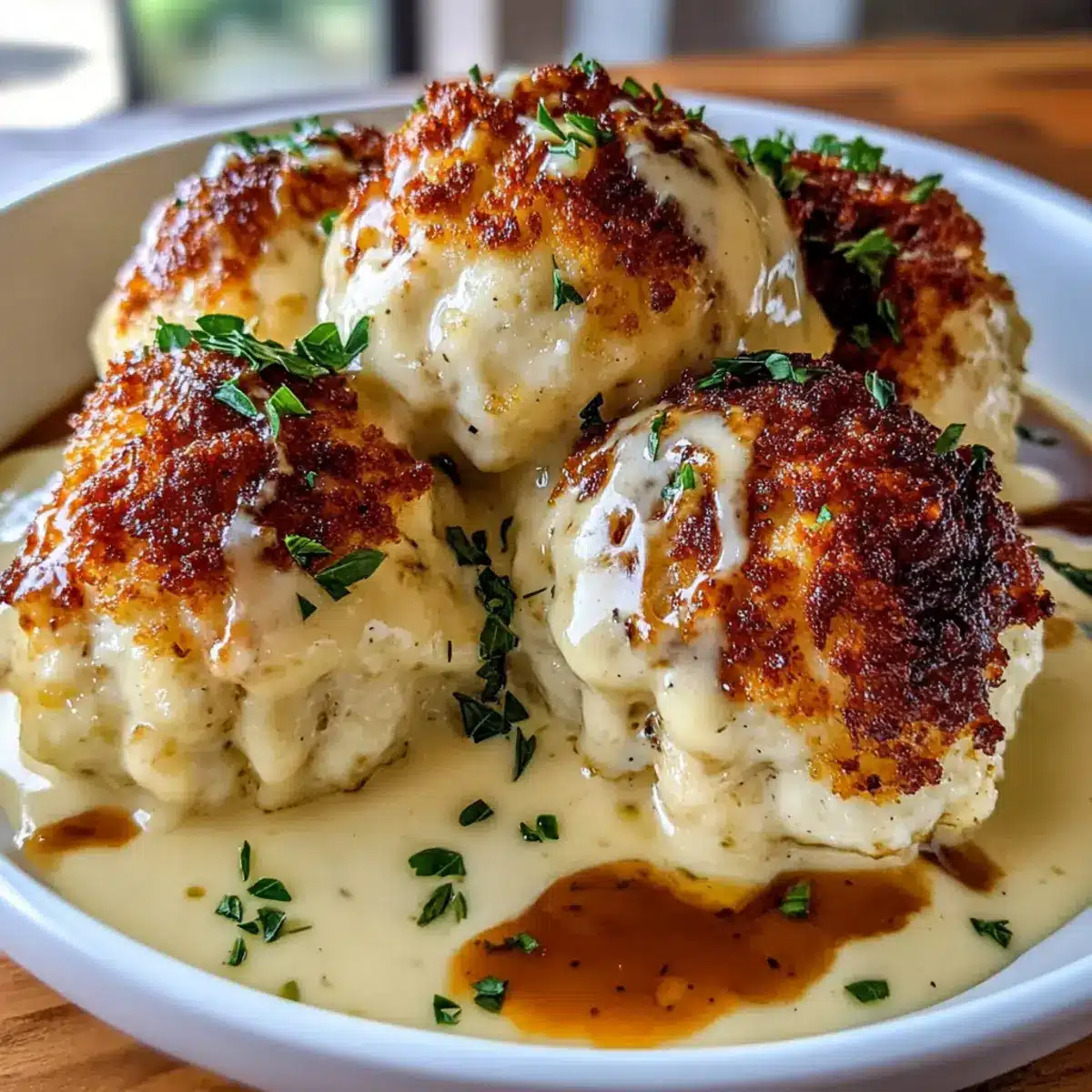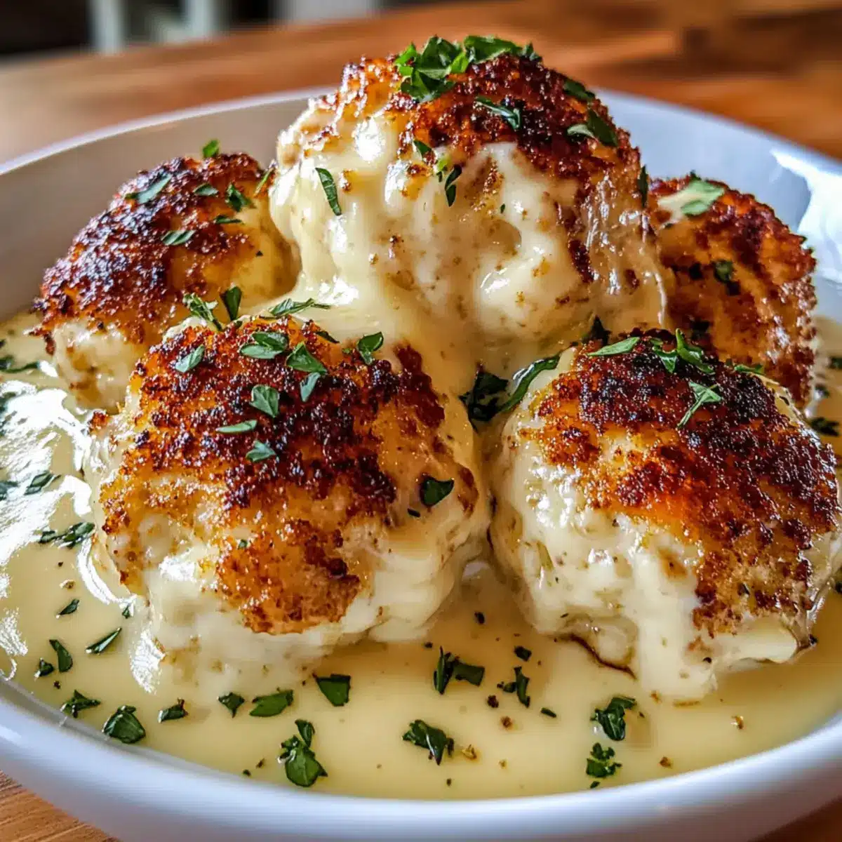 Once the chicken bombs are golden and cooked through, carefully transfer them to a casserole dish. Pour the creamy sauce over the top, ensuring each bomb is well coated. This adds an irresistible creamy layer to your Parmesan Cloud Chicken Bombs, enhancing their flavor and texture.