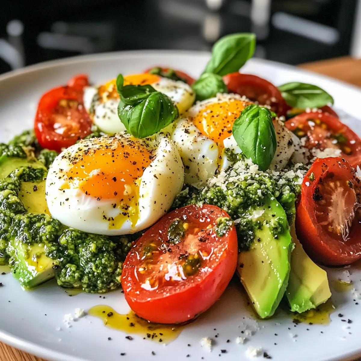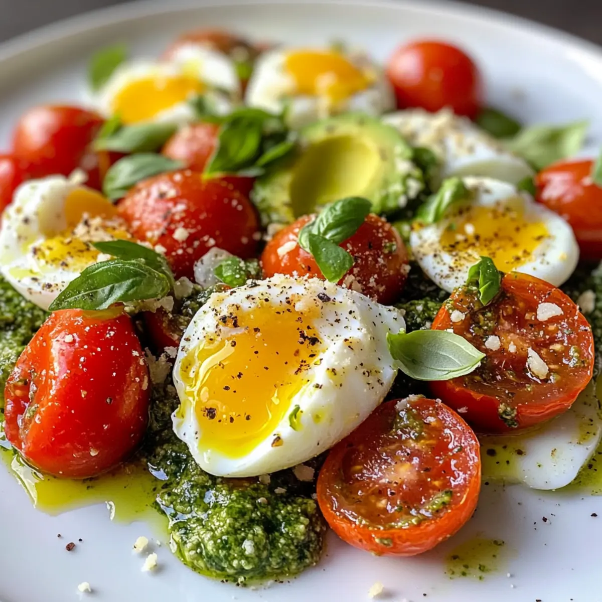 Prep Storage: To save time, prepare the salad base (tomatoes, avocado, and pesto dressing) ahead of time. Store these in the fridge for up to 1 day before adding poached eggs and seasoning.