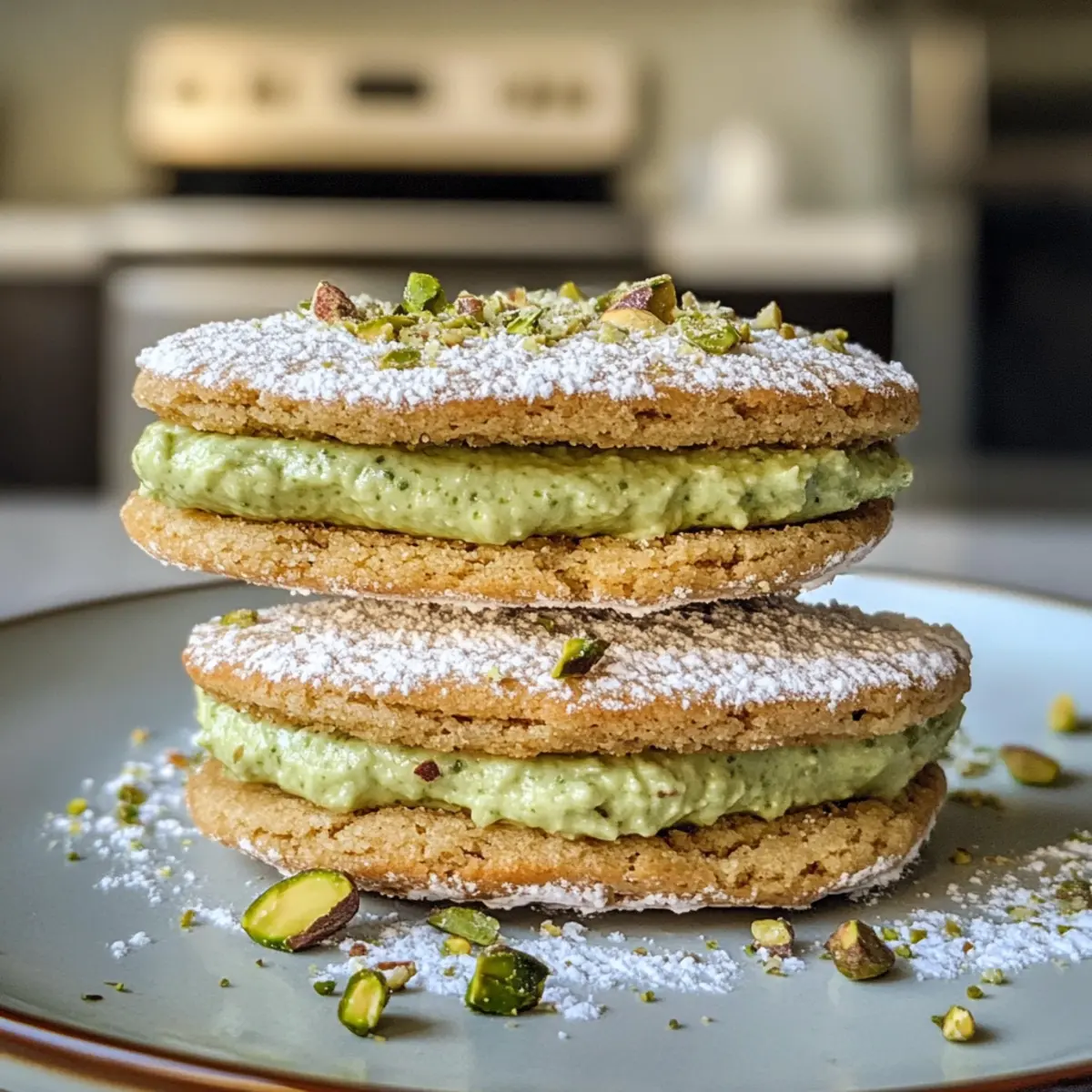 To add a final touch, dust the assembled Pistachio Cream Cookies with powdered sugar and sprinkle crushed pistachios on top. This not only enhances their visual appeal but also adds a lovely crunch. Place them on a serving platter and prepare to impress your family and friends with these delightful homemade treats!