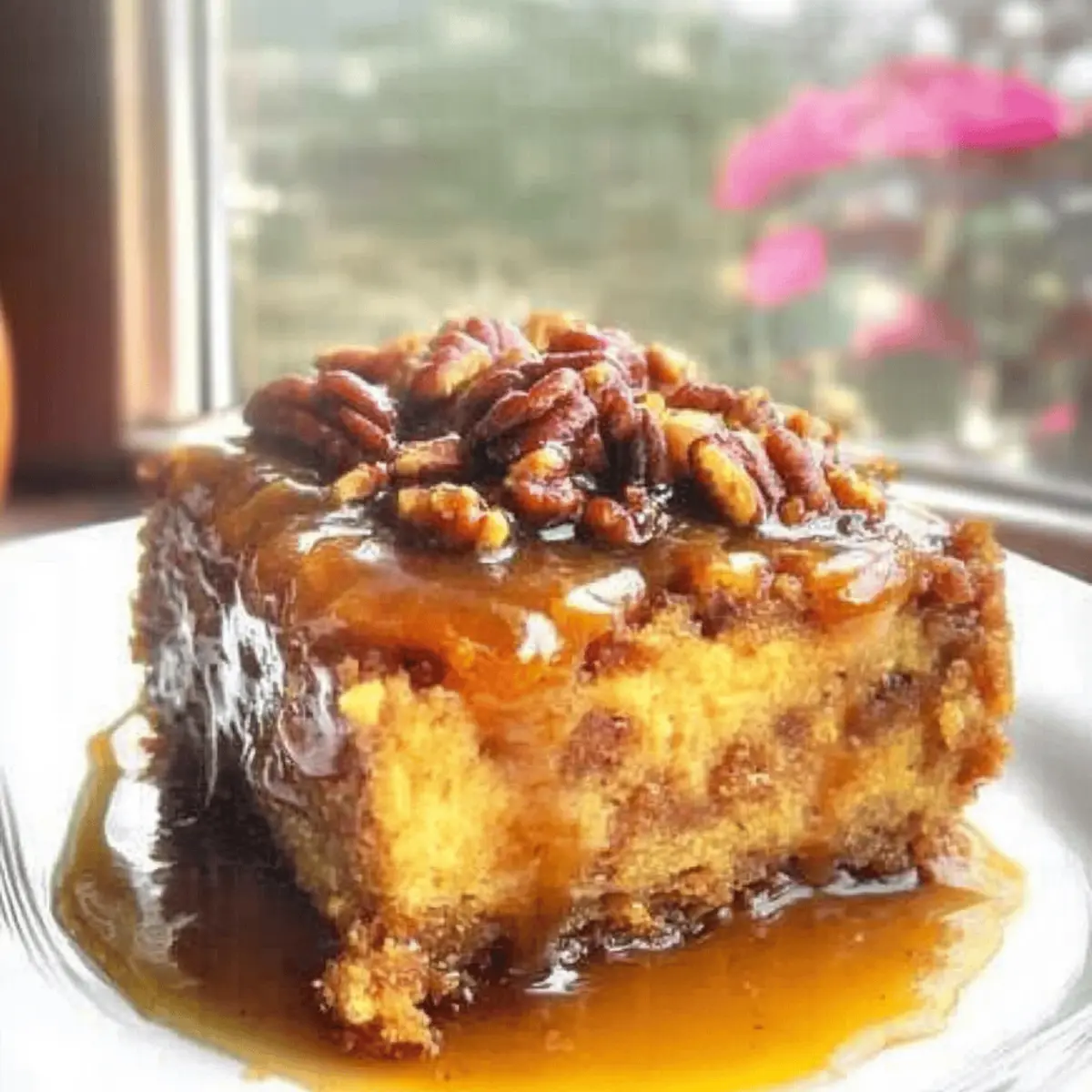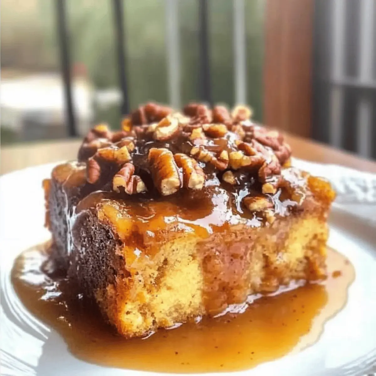 - While baking, prepare the praline sauce by combining unsalted butter, heavy cream, and brown sugar in a saucepan. Bring to a boil, then simmer for 5 minutes until thickened.