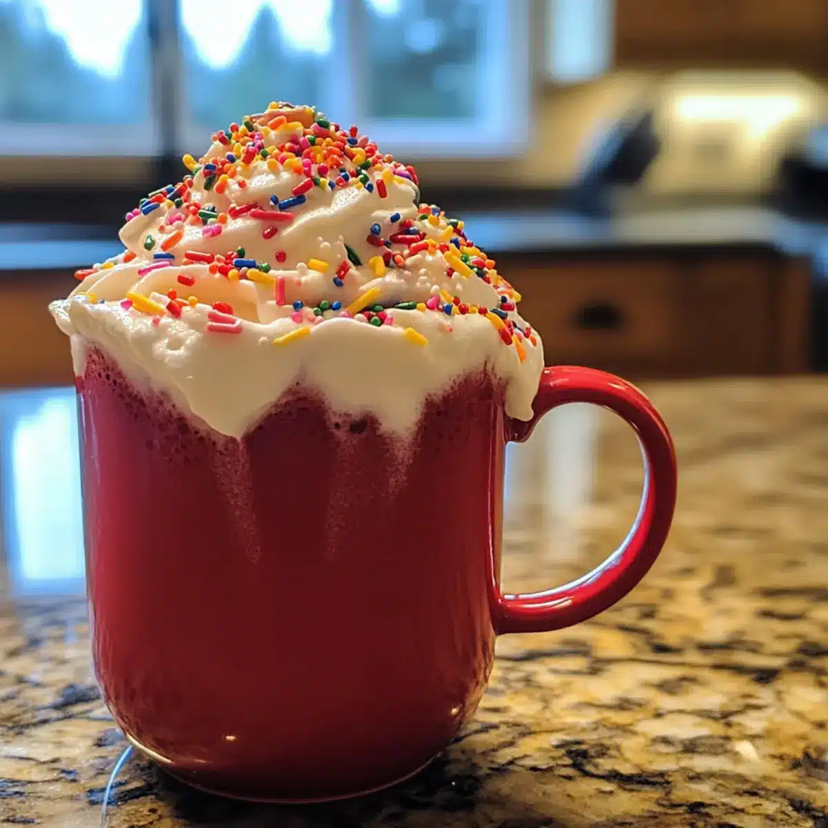 Once everything is well combined and aromatic, remove the saucepan from the heat. Carefully pour the luxurious Red Velvet Hot Chocolate into your favorite mug, filling it generously. Top it off with a dollop of whipped cream, and for a festive touch, sprinkle edible decorations or colorful sprinkles on top.