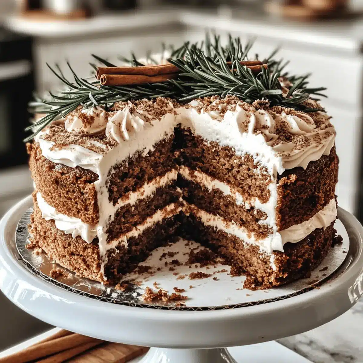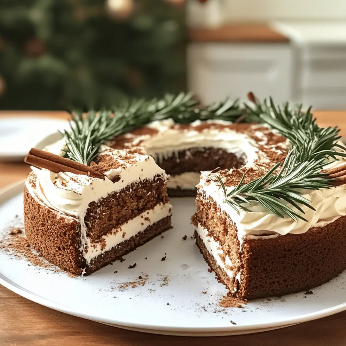 Once the cake is completely cooled, generously spread the whipped cream frosting over the top, allowing it to cascade down the sides. For a festive touch, decorate with fresh rosemary, star anise, and cinnamon sticks. These garnishes not only enhance the appearance but also add an extra layer of seasonal aroma to your Spiced Gingerbread Wreath Cake.