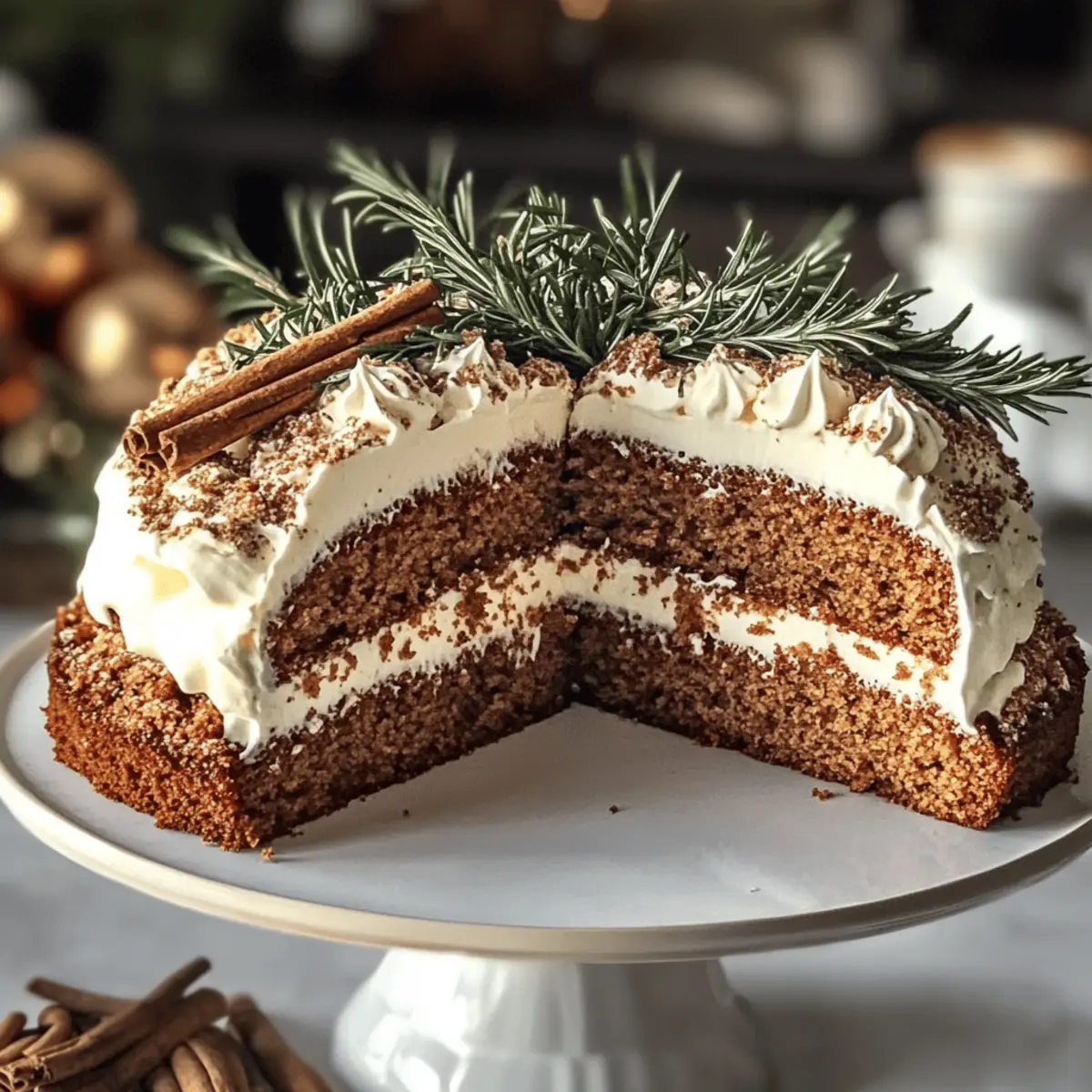 - Spread the whipped cream frosting over the cooled cake and decorate with rosemary, star anise, and cinnamon sticks.