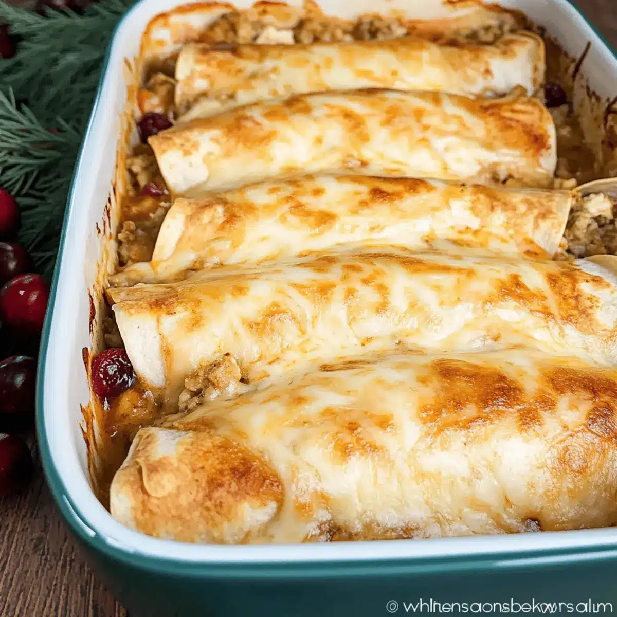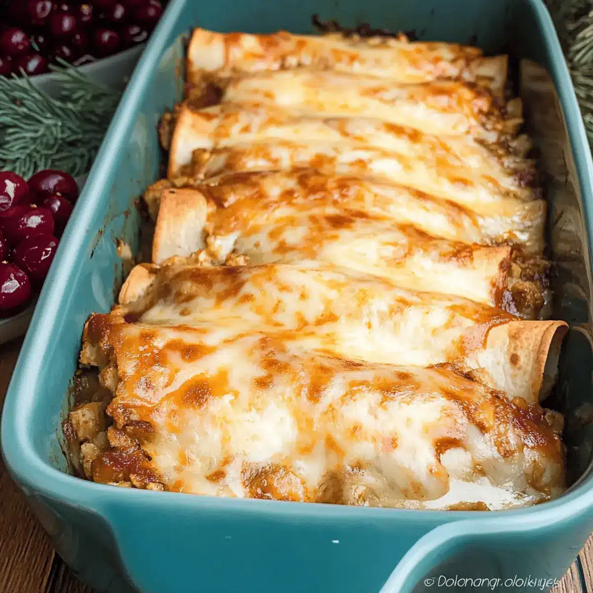 Carefully roll each tortilla tightly, placing each one seam-side down in the baking dish. Aim for a snug fit to keep the filling intact while baking. Watching these beauties come together is half the fun, as they embody the heartwarming spirit of holiday leftovers.